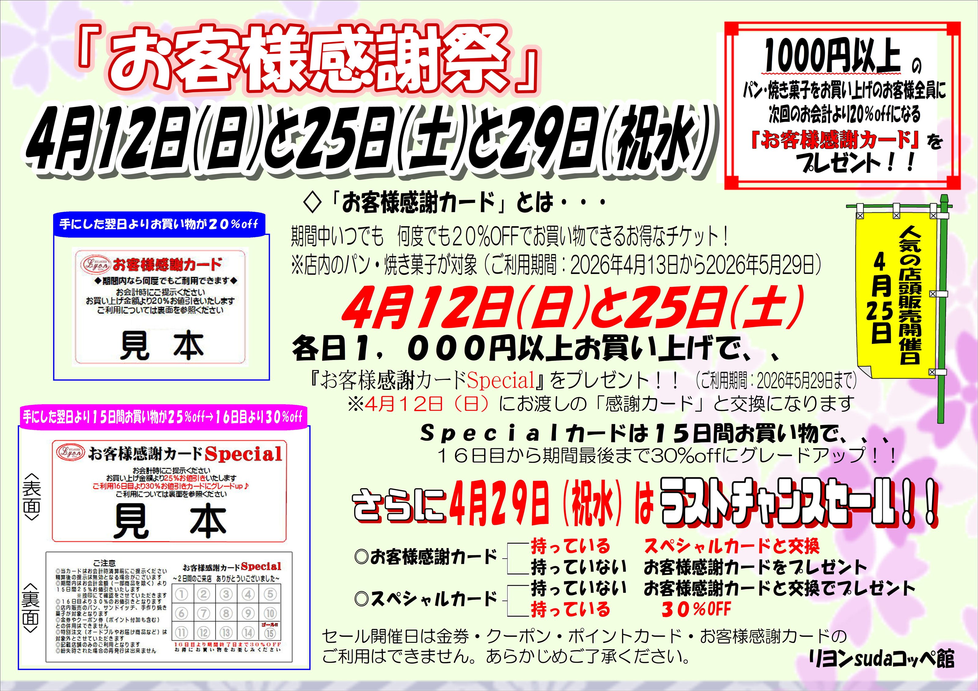 2日目は初日のご来店でお持ちの「お客様感謝カード」と交換で「お客様感謝カードSpecial」へグレードアップ!!期間内の焼菓子とパンのお会計が20%offから25%offへ・・・だけではなく「Specialカードはご利用16日目から30%off」となるとてもお得なカードです。
